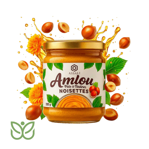 L’Amlou noisettes – ASSALI est une pâte artisanale marocaine qui associe des noisettes grillées, du miel pur et de l’huile d’argan alimentaire. Originaire du sud du Maroc, cette préparation gourmande est appréciée pour sa texture onctueuse et son goût raffiné. Ainsi, elle allie authenticité, plaisir et richesse nutritionnelle dans un seul pot.