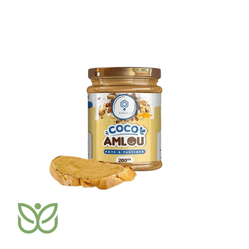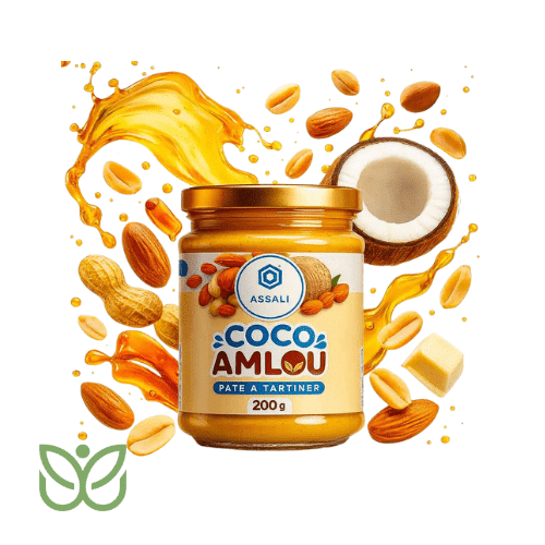 Le Coco Amlou est une pâte artisanale marocaine préparée avec de la noix de coco râpée, du miel pur et de l’huile d’argan alimentaire. Cette alliance gourmande séduit par sa texture onctueuse, son goût exotique et ses bienfaits nutritionnels. Ainsi, il offre une alternative raffinée à la pâte à tartiner traditionnelle.