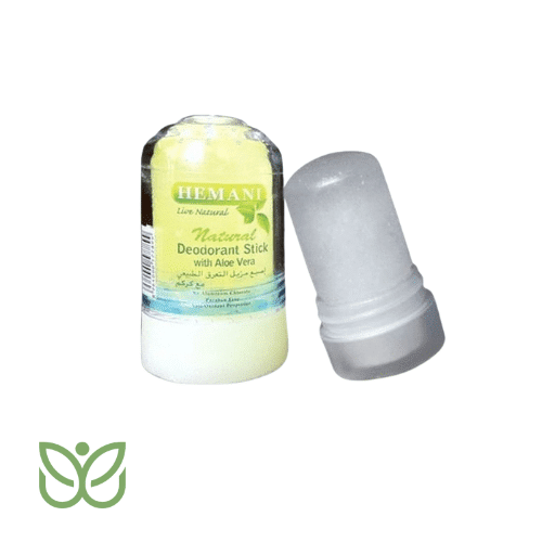 La Pierre d’alun en stick à l’aloe vera – HEMANI est un déodorant 100 % naturel conçu pour réguler la transpiration tout en respectant la peau. Elle associe les propriétés astringentes de la pierre d’alun et les vertus apaisantes de l’aloe vera. Ainsi, elle offre fraîcheur, protection et confort tout au long de la journée.